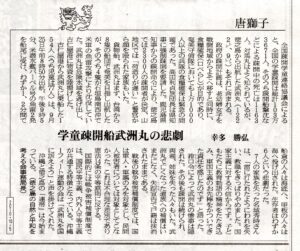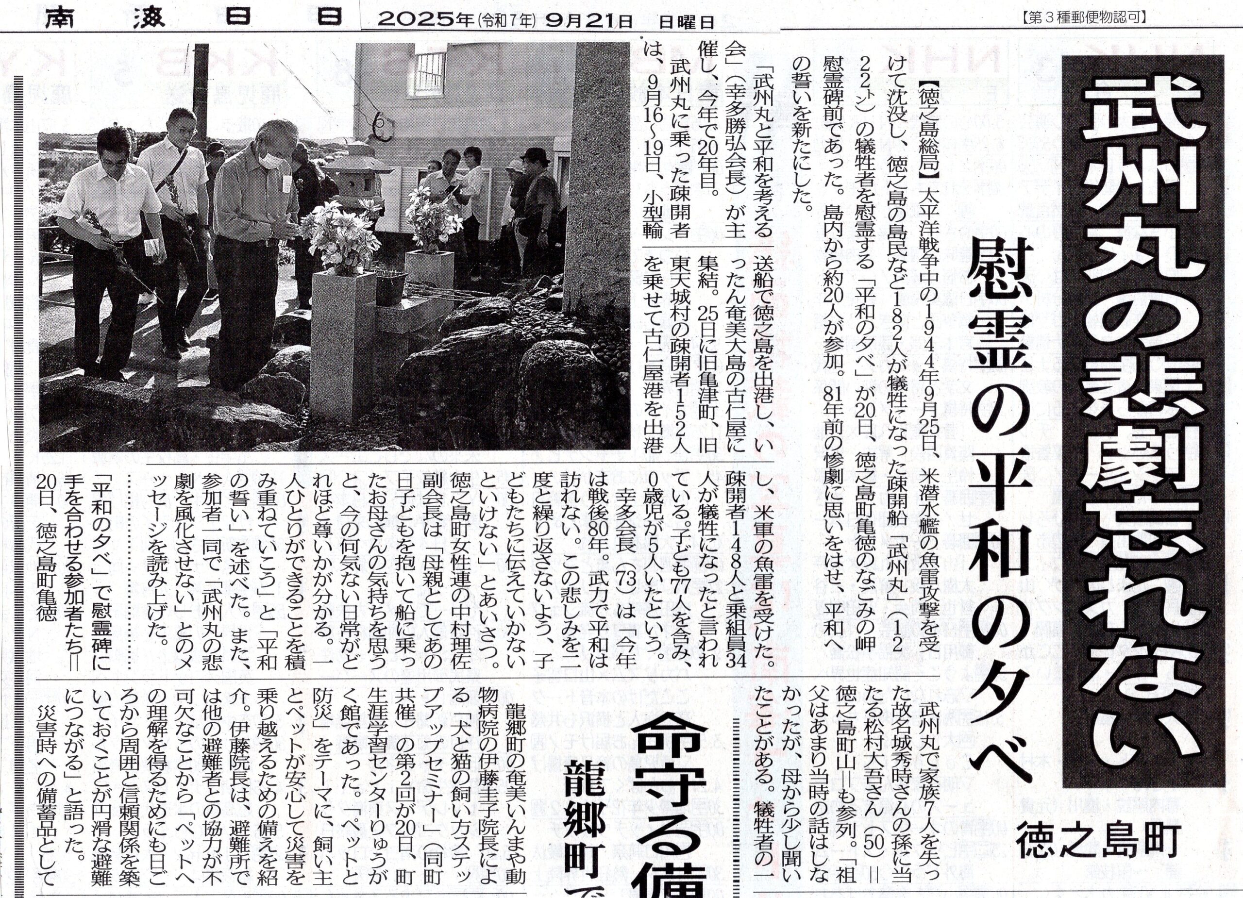 疎開命令のもとに撃沈された。1944年9月25日武州丸悲劇の前に、8月22日対馬丸、6月29日富山丸 国は全てを隠した。最近は国の名のもとに日米訓練が強行される。住民ではどうしようもない、「あの悲惨な出来事を繰り返さない、安らかに眠って下さい」と御霊に約束報告していいのだろうか。国民保護法案の下、いつ脱出するかわからない。ノアの箱舟の定員は、対象は?不安な時代に生きている。