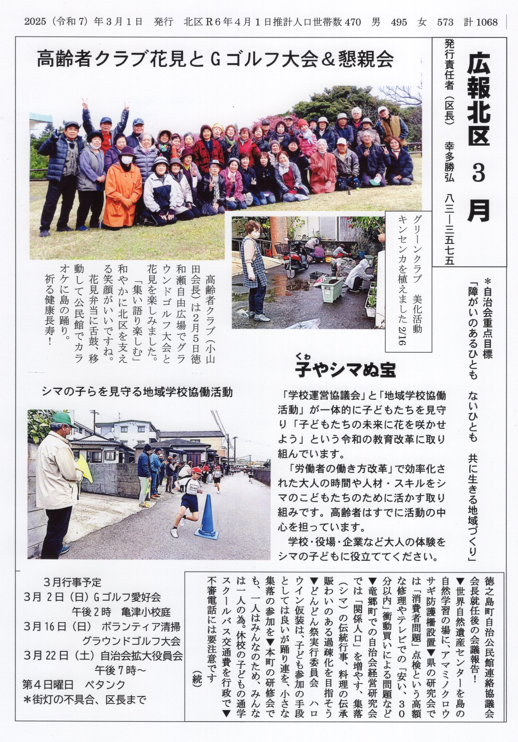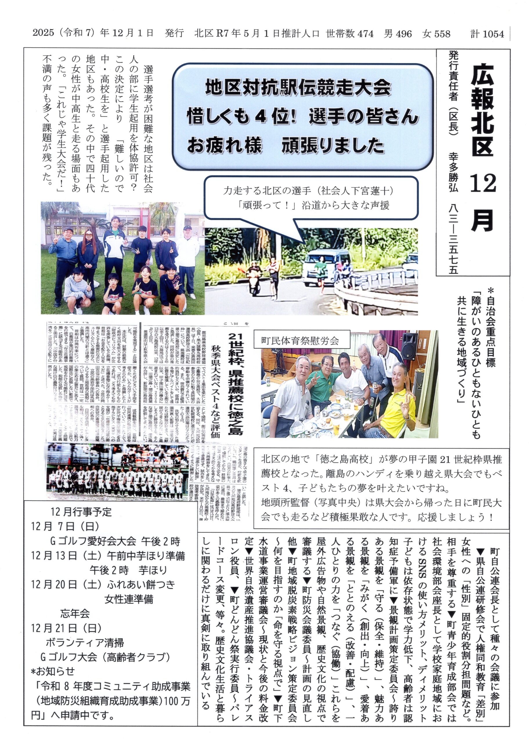 北区自治会行事諸々 *地域学校協働活動が軌道に乗りつつある!双方向で繋がり深まる Posted on 2025年12月29日 by katuhiro 他者をリスペクト(尊敬)すれば戦争は起きない。足下である地域の繋がりなくして世界平和も実現不可能だと思う。だが人は「旨味」を追求する。エコツアガイドもお金を追求すれば島の宝が味気ないものに見える。そこに住む人が足元の文化自然を語ればいいと思う。鍵を閉めて保護の名の下で島の人から世界自然遺産を見えにくくしている、とシマンチュは言う。誰のための自然か、また誰が守ってきたのか。金もうけのためではないはずだ。島の景観をシマンチュのために残せるのか。今問われている。
